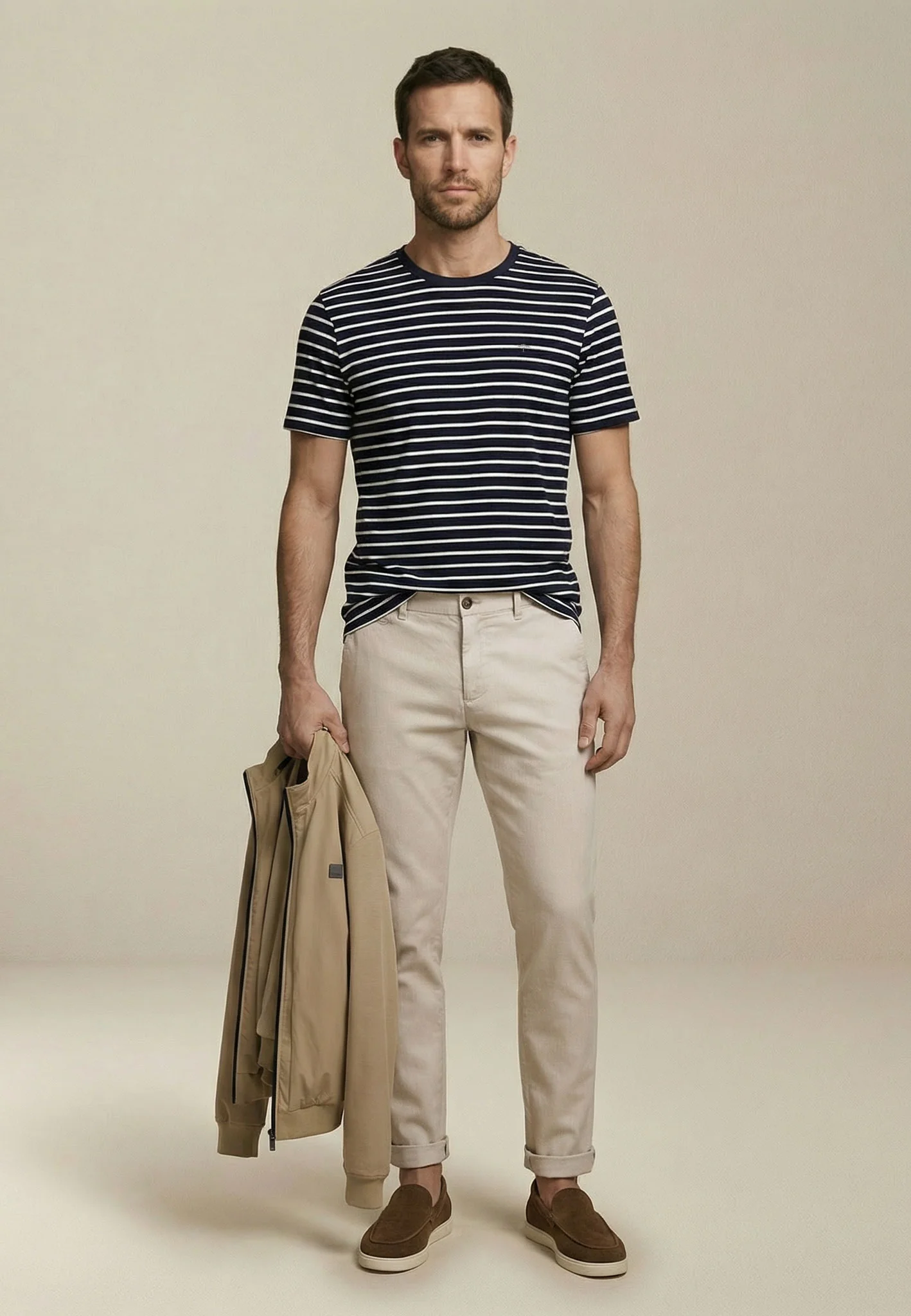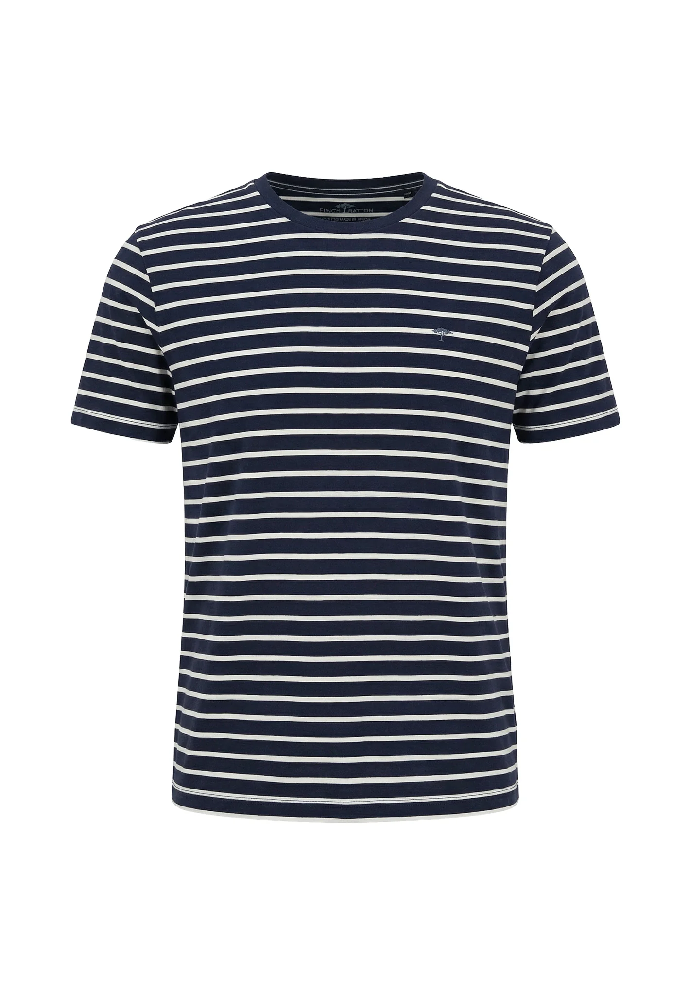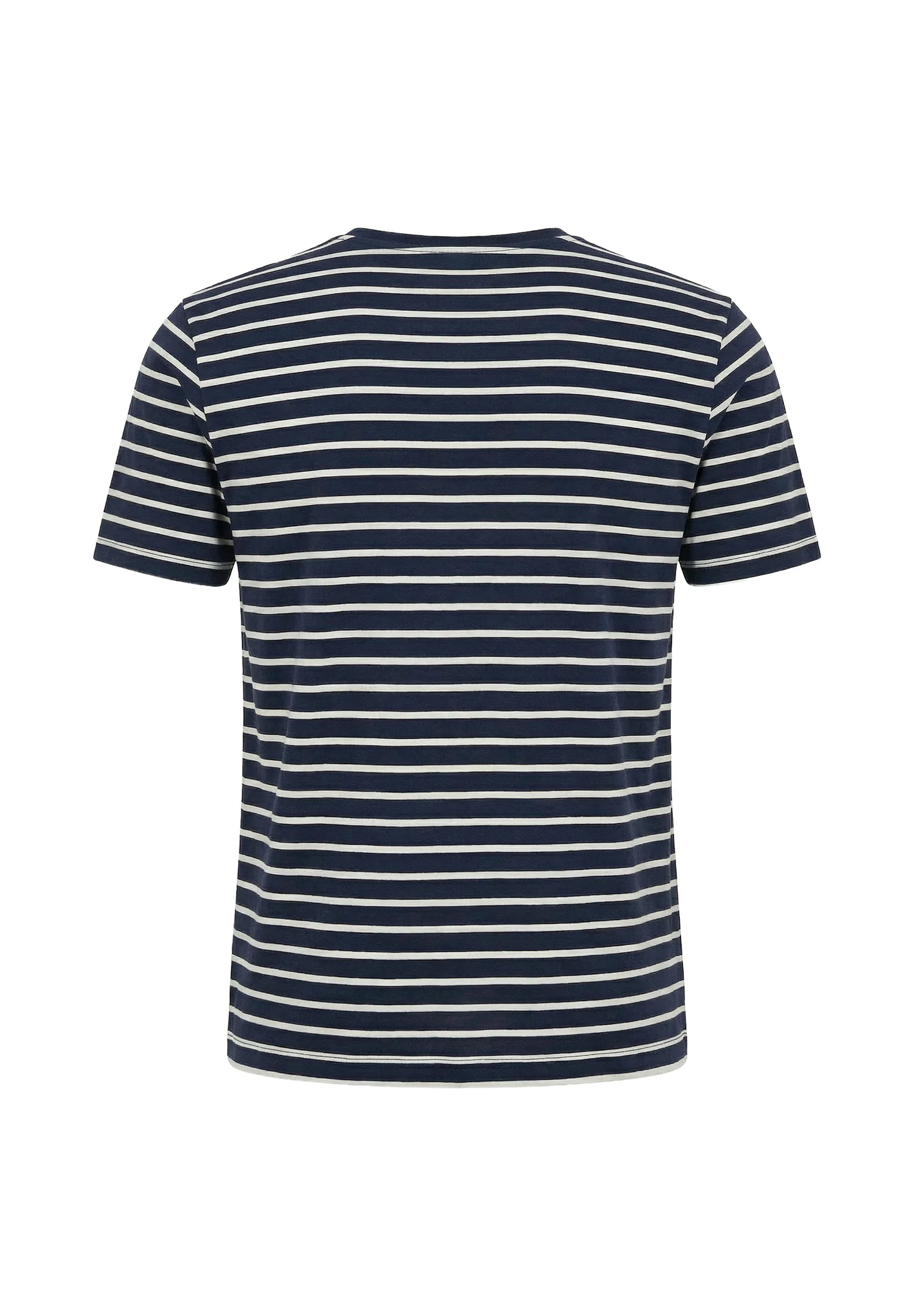 Αυτό το μπλουζάκι εντυπωσιάζει με το κλασικό ριγέ μοτίβο του και τη διαχρονική, ναυτική του εμφάνιση. Το καθαρό βαμβάκι εξασφαλίζει μια ευχάριστα απαλή αίσθηση και εξαιρετική αναπνοή για καθημερινή χρήση. Η στρογγυλή λαιμόκοψη τονίζει τον casual χαρακτήρα του, ενώ οι διακριτικές ρίγες σε αντίθεση προσθέτουν δομή και βάθος στο σχέδιο. Το διακριτικό κέντημα στο στήθος ολοκληρώνει αρμονικά τη συνολική εμφάνιση. Είτε συνδυάζεται με chinos παντελόνια, σορτς ή τζιν, αυτό το μπλουζάκι είναι ένας ευέλικτος σύντροφος για χαλαρά αλλά και κομψά casual ντυσίματα.