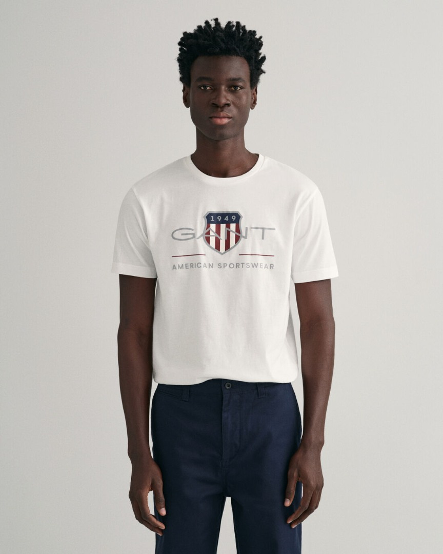 Ανδρική Κοντομάνικη μπλούζα της εταιρείας GANT. Ανήκει στην Archive Shield συλλογή της εταιρείας και χαρακτηρίζεται από το logo print που έχει τυπωμένο στο κέντρο. Ενώ, τέλος είναι σε άνετη γραμμή, από απαλό πιστοποιημένο οργανικό ύφασμα.